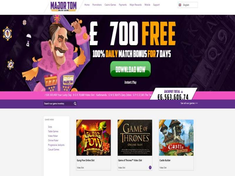 Казино Major Tom было основано в 2013 году и названо в честь известной песни Дэвида Боуи с тем же названием. Казино принадлежит и управляется компанией Digimedia, которая также управляет почти 20 другими казино. Major Tom пользуется высокой репутацией среди игроков, которые хвалят казино за обширную библиотеку игр, отличное обслуживание и превосходное управление. 16 апреля 2015 года компания Fortune Affiliates объявила о закрытии казино Major Tom с 23 апреля 2015 года. Все учетные записи игроков Major Tom будут перенесены в казино Red Flush, и все данные для входа останутся прежними.Информация о казино
