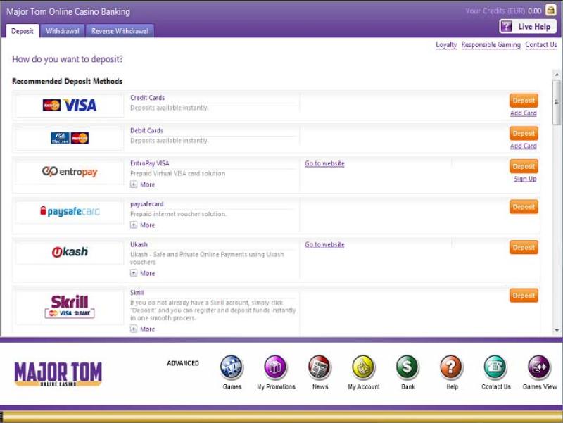 Казино Major Tom работает на программном обеспечении Microgaming and Games Global , которое предоставляет игрокам сотни игр, а также отличную платформу, удобную для навигации. Major Tom имеет веб-платформу, а также загружаемый программный клиент, который позволяет загружать все игры непосредственно на ваш компьютер. Также существует мобильная версия казино, позволяющая игрокам играть через смартфоны или планшеты.Blackjack