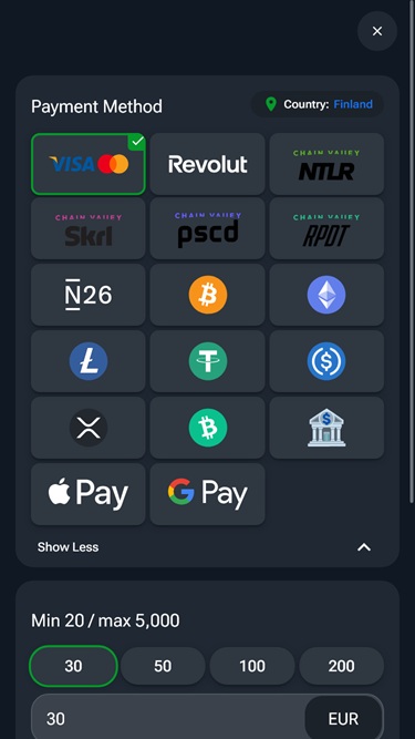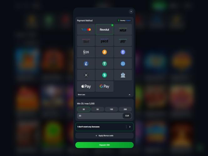 Для пополнения счета и вывода средств игроки могут использовать исключительно криптовалюты, такие как Bitcoin , Bitcoin Cash , Ethereum , Litecoin , USD Coin и Tether . Важно также отметить, что игроки могут покупать криптовалюту напрямую на сайте, используя традиционные банковские карты, такие как Visa и Mastercard, если у них нет опыта работы с криптовалютными транзакциями .