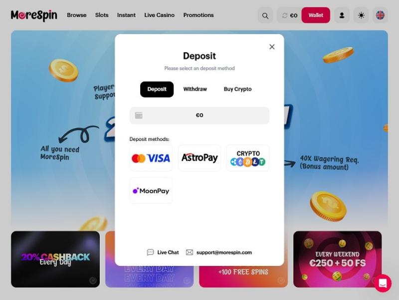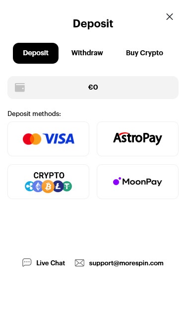 В казино MoreSpin вы можете выбрать один из популярных способов оплаты, таких как Visa, MasterCard, AstroPay и другие электронные кошельки. Операторы также позволяют игрокамвносить депозиты и выводить средства с помощью криптовалют.