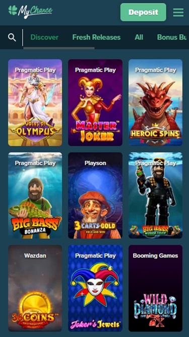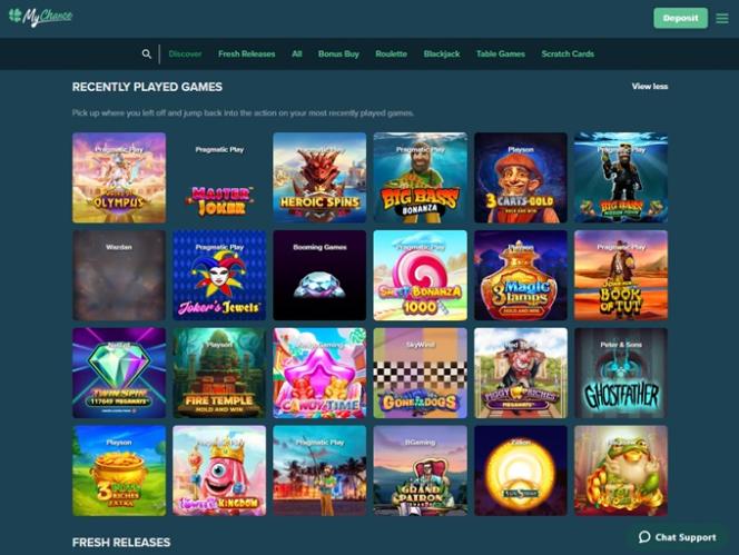 В MyChance представлены сотни игровых автоматов от таких гигантов, как Microgaming и NetEnt. Вы найдете огромный выбор бонусных функций и тематик, так что, скорее всего, вам понравится что-нибудь из представленного ассортимента. Доступны прогрессивные джекпоты, такие как Mega Moolah и Arabian Nights, а также игры, совместимые с мобильными устройствами.