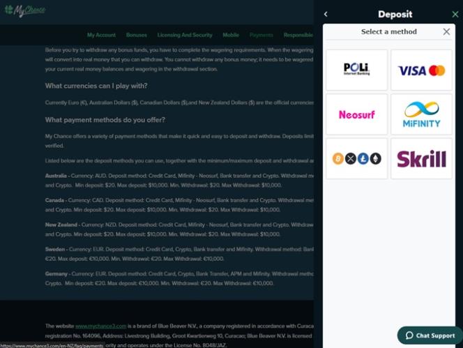 MyChance Casino не принимает игроков из следующих стран: Афганистан, Алабама, Аландские острова, Аляска, Албания, Олдерни, Алжир, Американское Самоа, Андорра, Ангола, Ангилья, Антарктида, Антигуа и Барбуда, Аргентина, Аризона, Арканзас, Армения, Аруба, Австрия, Азербайджан, Багамы, Бахрейн, Бангладеш, Барбадос, Беларусь, Бельгия, Белиз, Бенин, Бермудские острова, Бутан, Боливия, Босния и Герцеговина, Ботсвана, Остров Буве, Бразилия, Британская территория в Индийском океане, Бруней, Болгария, Буркина-Фасо, Бурунди, Калифорния, Камбоджа, Камерун, Кабо-Верде, Каймановы острова, Центральноафриканская Республика, Чад, Чили, Китай, Остров Рождества, Кокосовые (Килингтонские) острова, Колумбия, Колорадо, Коморские острова, Конго, Демократическая Республика Конго, Коннектикут, Острова Кука, Коста-Рика, Берег Слоновой Кости, Хорватия, Куба, Кюрасао, Кипр, Чешская Республика, округ Колумбия, Делавэр, Дания, Джибути, Доминика, Доминиканская Республика, Эквадор, Египет, Сальвадор, Экваториальная Гвинея, Эритрея, Эстония, Эфиопия, Фолклендские острова (Мальвинские острова), Фарерские острова, Фиджи, Финляндия, Флорида, Франция, Французская Гвиана, Французская Полинезия, Французские Южные Территории, Габон, Гамбия, Джорджия, Джорджия, Гана, Гибралтар, Греция, Гренландия, Гренада, Гваделупа, Гуам, Гватемала, Гвинея, Гвинея-Бисау, Гайана, Гаити, Гавайи, Острова Херд и Макдональд, Гондурас, Гонконг, Венгрия, Исландия, Айдахо, Иллинойс, Индия, Индиана, Индонезия, Айова, Иран, Ирак, Ирландия, Остров Мэн, Израиль, Италия, Ямайка, Япония, Джерси, Иордания, Канзас, Казахстан, Кентукки, Кения, Кирибати, Корейская Народная Демократическая Республика, Республика Корея, Кувейт, Кыргызстан, Лаос, Латвия, Ливан, Лесото, Либерия, Ливия, Лихтенштейн, Литва, Луизиана, Люксембург, Макао, Мадагаскар, Мэн, Малави, Малайзия, Мальдивы, Мали, Мальта, Маршалловы острова, Мартиника, Мэриленд, Массачусетс, Мавритания, Маврикий, Майотта, Мексика, Мичиган, Микронезия, Федеративные Штаты, Миннесота, Миссисипи, Миссури, Молдавия, Монако, Монголия, Монтана, Черногория, Монтсеррат, Марокко, Мозамбик, Мьянма, Намибия, Науру, Небраска, Непал, Нидерланды, Нидерландские Антильские острова, Невада, Новая Каледония, Нью-Гэмпшир, Нью-Джерси, Нью-Мексико, Нью-Йорк, Никарагуа, Нигер, Нигерия, Ниуэ, Остров Норфолк, Северная Каролина, Северная Дакота, Северная Македония, Северные Марианские острова, Норвегия, Огайо, Оклахома, Оман, Онтарио, Орегон, Пакистан, Дворец, Палестина, Панама, Папуа-Новая Гвинея, Парагвай, Пенсильвания, Перу, Филиппины, Питкэрн, Польша, Португалия, Пуэрто-Рико, Катар, Воссоединение, Род-Айленд, Румыния, Россия, Руанда, Святая Елена, Сент-Китс и Невис, Сент-Люсия, Святой Мартин, Сен-Пьер и Микелон, Сент-Винсент и Гренадины, Самоа, Сан-Марино, Сан-Томе и Принсипи, Саудовская Аравия, Сенегал, Сербия, Сейшельские острова, Сьерра-Леоне, Сингапур, Словакия, Словения, Соломоновы острова, Сомали, ЮАР, Южная Каролина, Южная Дакота, Южная Георгия и Южные Сандвичевы острова, Южный Судан, Испания, Шри-Ланка, Судан, Суринам, Шпицберген и Ян-Майен, Свазиленд, Швейцария, Сирия, Тайвань, Таджикистан, Танзания, Теннесси, Техас, Таиланд, Тимор-Лесте, Того, Токелау, Приехал, Тринидад и Тобаго, Тунис, Турция, Туркменистан, Острова Теркс и Кайкос, Тувалу, Уганда, Украина, Объединенные Арабские Эмираты, Великобритания, Соединенные Ш