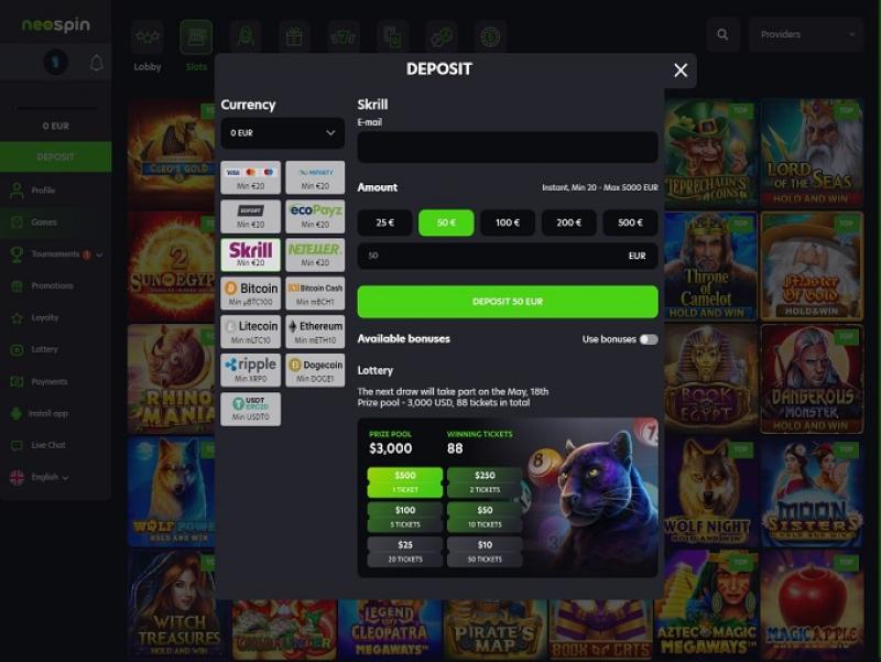 Помимо VIP-программы лояльности Neospin, предлагающей лутбоксы со скрытыми привлекательными азартными играми, активные игроки могут рассчитывать на участие в турнирах и лотереях казино, получение еженедельных бонусных вращений, еженедельного бонуса за пополнение счета и кэшбэка. Обратите внимание, что для выигрышей, полученных с помощью бонуса кэшбэка, нет ограничений на максимальную сумму вывода.