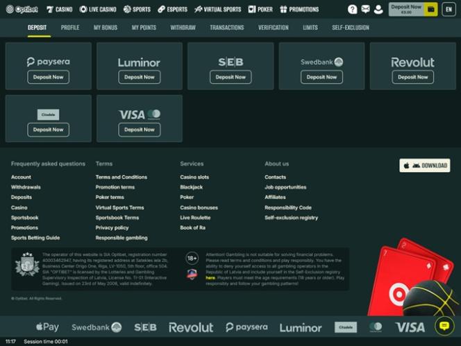 Казино Optibet работает на программном обеспечении Microgaming, Net Entertainment, Playtech, 1x2gaming, Barcrest, Big Time Gaming, ELK Studios, Evolution Gaming, Habanero Systems, iSoftBet, lightningboxgames, Novomatic, Oryx, Play'n GO, playson, Quickspin, Rabcat, Relax Gaming, Thunderkick, Yggdrasil, Endorphina, Wazdan, Realistic Games, Betgames, Stakelogic, Pragmatic Play, Nolimit City, Felt Gaming, Red Tiger Gaming, IGT, Air Dice, Red Rake Gaming, Fantasma Games, FunFair, SYNOT Games, Kalamba, Platipus Gaming, Skywind, Triple Edge Studios, Northern Lights Gaming, Evoplay, Stormcraft Studios, Switch Studios, Electric Elephant Games, Pocket Games Soft, Bulletproof Games, All41 Studios, Gluck Games, Gameburger Studios, Pulse 8 Studios, Slot Factory, Neon Valley Studios, Golden Rock Studios, Spearhead Studios, Swintt, Shuffle Master, SpinPlay Games, HungryBear Gaming, Real Dealer Studios, GONG Gaming, Blue Guru Games, Lady Luck Games, On Air Entertainment, Buck Stakes Entertainment, Elysium Studios, Eurasian Gaming, Games Global, Amusnet Interactive, Wizard Games, Bally Technologies, Blueprint Gaming, EveryMatrix, Greentube, Leander Games, Merkur Gaming, NeoGames, NextGen, NYX Interactive, Pariplay, Push Gaming, Tom Horn Gaming, WMS, Inspired Gaming, Gaming Realms, SG Interactive, Gamomat, Red7Mobile, CORE Gaming, Scientific Games, Side City Studios, Reel Time Gaming, Authentic Gaming, BF Games, Bally Wulff, Iron Dog Studio, Old Skool Studios, Foxium, Betdigital, Just For The Win, Reflex Gaming, Storm Gaming Technology, PearFiction Studios, Wild Streak Gaming, Slingshot Studios, Fortune Factory Studios, Jade Rabbit Gaming, Green Jade Games, STHLM Gaming, RubyPlay, 4ThePlayer, AvatarUX, Gamevy, Crazy Tooth Studio, Pirates Gold Studios, ReelPlay, Japan Technicals Games, AGS Interactive, Alchemy Gaming, Snowborn Games, Boomerang Studios, Hacksaw Gaming, Max Win Gaming, Gold Coin Studios, Bang Bang Games, Half Pixel Studios, Arcadem, Slotmill, Peter And Sons, Eurostar Studios, Aurum Signature Studios, Armadillo Studios, Lucksome Gaming, FlipLuck, Area Vegas, RAW iGaming, Wishbone Games, Spribe, Circular Arrow, Print Studios, HammerTime Games, Four Leaf Gaming, INO Games, Nailed It! Games, Neko Games, Reel Kingdom, Oros Gaming, JVL, Light & Wonder and Kitsune Studios , и игры казино доступны через веб-платформу, а это значит, что вам не нужно скачивать какое-либо программное обеспечение, чтобы попытать удачу. У казино также есть мобильная версия для игроков, которые хотят играть на своих смартфонах или планшетах.