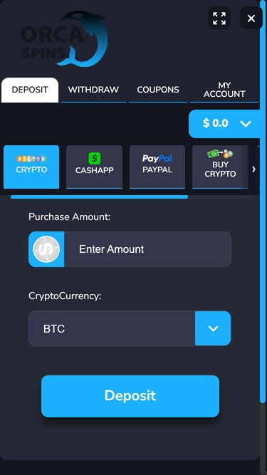 Если вы находитесь в США и ищете простое казино, Orca Spins может вам подойти. Это сайт, дружелюбный к криптовалютам , что означает более быстрые выводы средств и отсутствие необходимости ждать выплат. Для пополнения и вывода средств доступны Bitcoin, Ethereum и несколько других вариантов — это очень удобно, если вам нравится гибкость, которую предоставляют криптовалюты.