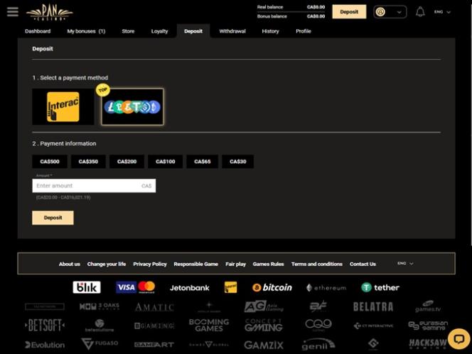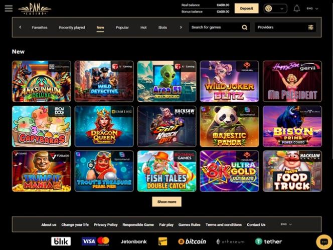 Pan Casino поддерживает множество фиатных и цифровых валют, включая Cardano, Bitcoin Cash, Bitcoin, канадский доллар, Ethereum, Litecoin, польский злотый, Solana, Toncoin, TRON, USD Coin, Tether, XRP…