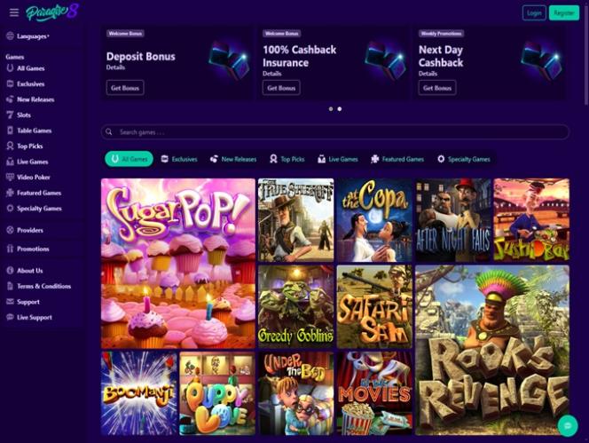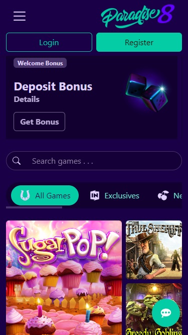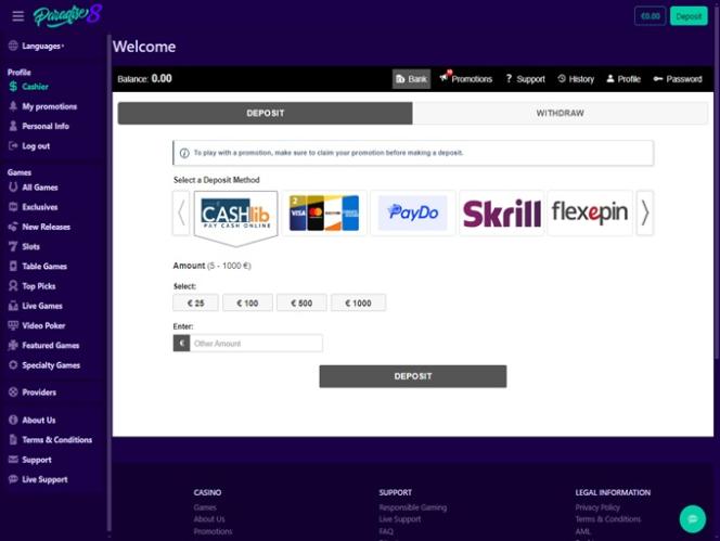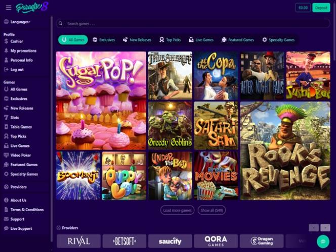 Казино Paradise 8 работает на программном обеспечении BetSoft, Genesis Gaming, Rival, Saucify, Vivo Gaming, Arrows Edge, Radi8 Games, Fresh Deck Studios, Woohoo Games, Qora Games, Genii and Dragon Gaming , что позволяет игрокам играть как с помощью загружаемых программ, так и в режиме мгновенной игры.Другие игры