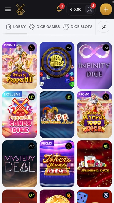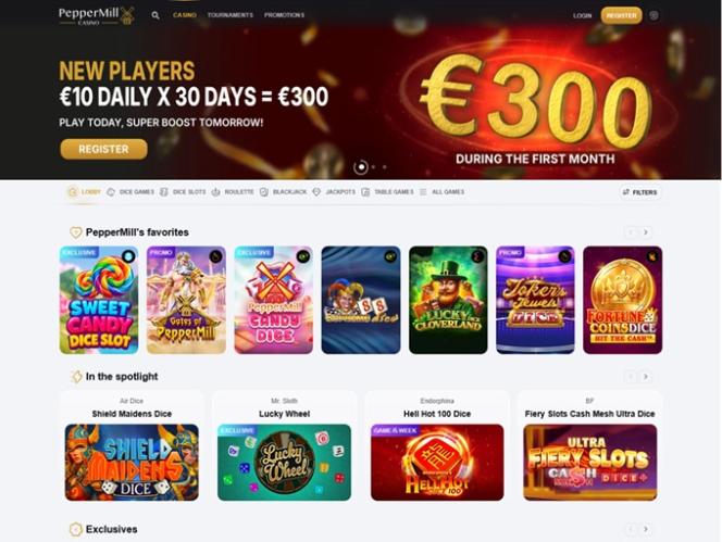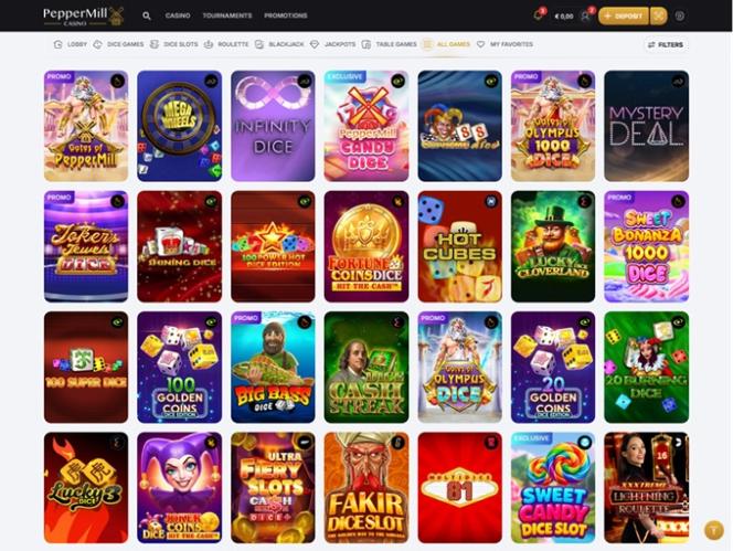 Присоединившись к казино PepperMill, вы сможете сыграть в отличные онлайн-слоты, такие как Book of Ra Dice, Mega Wheels, Starliner, Mega Spinner, 88 Mystery, 20 Dice Roosters, Hot Cubes, Mystery Deal, Supreme Dice, Extra Joker и многие другие.