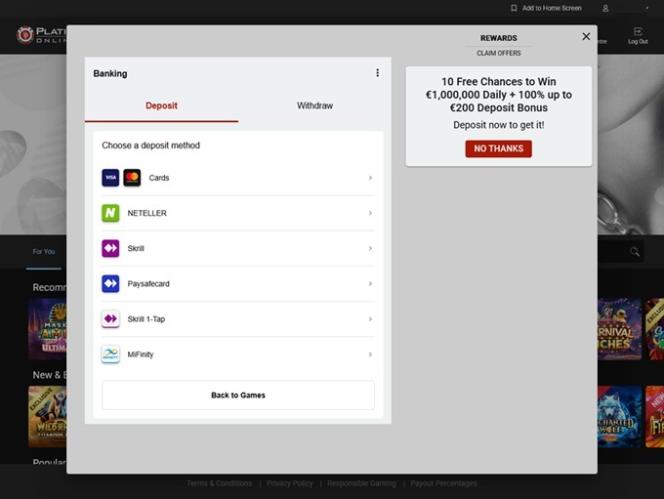Казино Platinum Play работает на программном обеспечении Microgaming, Net Entertainment, Evolution Gaming, Pragmatic Play, Red Tiger Gaming, Triple Edge Studios, Northern Lights Gaming, Stormcraft Studios, Switch Studios, All41 Studios, Gameburger Studios, Pulse 8 Studios, Neon Valley Studios, SpinPlay Games, Real Dealer Studios, GONG Gaming, On Air Entertainment, Buck Stakes Entertainment, Games Global, Old Skool Studios, Foxium, Just For The Win, PearFiction Studios, Wild Streak Gaming, Slingshot Studios, Fortune Factory Studios, Crazy Tooth Studio, Alchemy Gaming, Snowborn Games, Gold Coin Studios, Half Pixel Studios, Eurostar Studios, Aurum Signature Studios, Area Vegas, Wishbone Games, Circular Arrow, HammerTime Games, Nailed It! Games, Neko Games, Reel Kingdom and Oros Gaming , которое предлагает сотни игр, включая слоты, настольные игры и видеопокер. Казино доступно как через веб-платформу, так и через загружаемый программный клиент. Оба способа игры практически идентичны, и игроки, скорее всего, заметят разницу, за исключением редких изменений в оформлении. Мобильная версия сайта также поддерживает игру на смартфонах и планшетах.