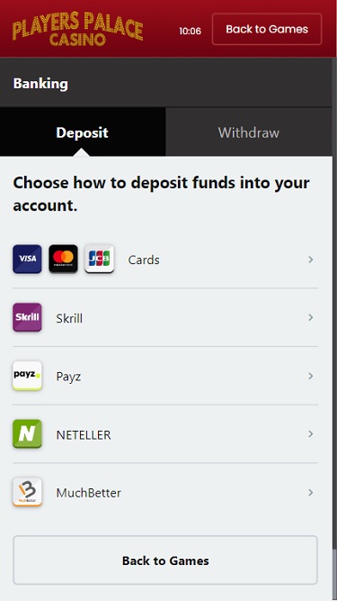 Казино Players Palace работает на программном обеспечении Microgaming, Evolution Gaming, Rabcat, Pragmatic Play, Triple Edge Studios, Northern Lights Gaming, Stormcraft Studios, All41 Studios, Gameburger Studios, Pulse 8 Studios, Neon Valley Studios, SpinPlay Games, Real Dealer Studios, GONG Gaming, On Air Entertainment, Buck Stakes Entertainment, Games Global, Old Skool Studios, Foxium, Just For The Win, PearFiction Studios, Slingshot Studios, Fortune Factory Studios, Crazy Tooth Studio, Alchemy Gaming, Snowborn Games, Gold Coin Studios, Half Pixel Studios, Eurostar Studios and Aurum Signature Studios , которое предоставляет игрокам доступ к игровой библиотеке, насчитывающей более 400 игр. Казино доступно как через загружаемый программный клиент, так и через веб-платформу. Игроки, желающие играть в казино на смартфонах и планшетах, могут сделать это через мобильный сайт Players Palace.Blackjack