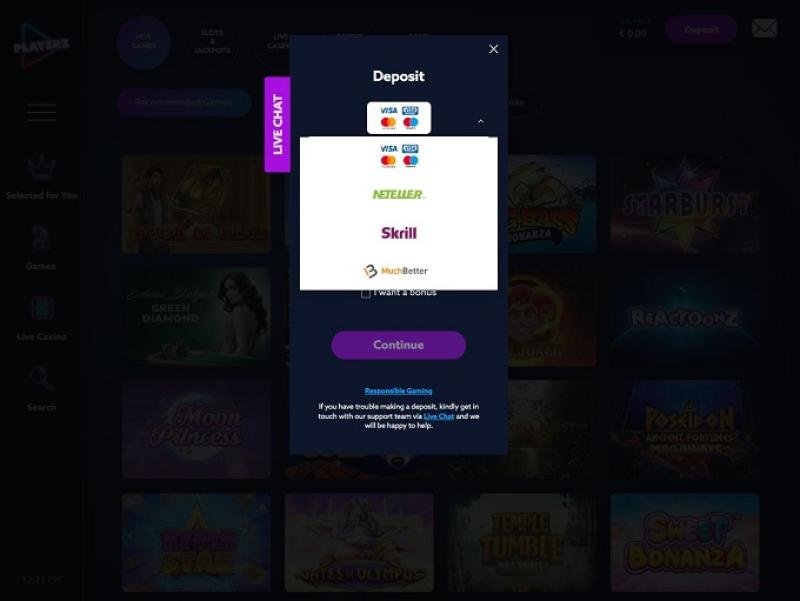 Казино Playerz поддерживает различные стандартные способы оплаты, такие как платежные карты, электронные кошельки и банковские переводы. На момент написания этого обзора доступные способы оплаты также включают привлекательные варианты для некоторых рынков, например, RuPay для игроков онлайн-казино из Индии .