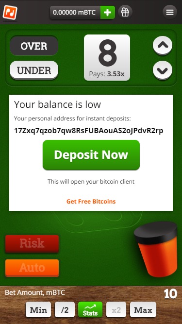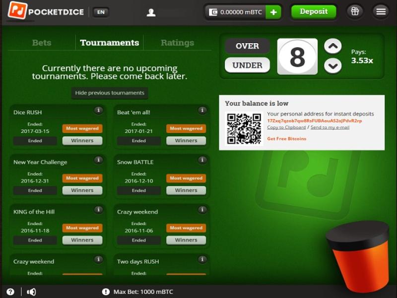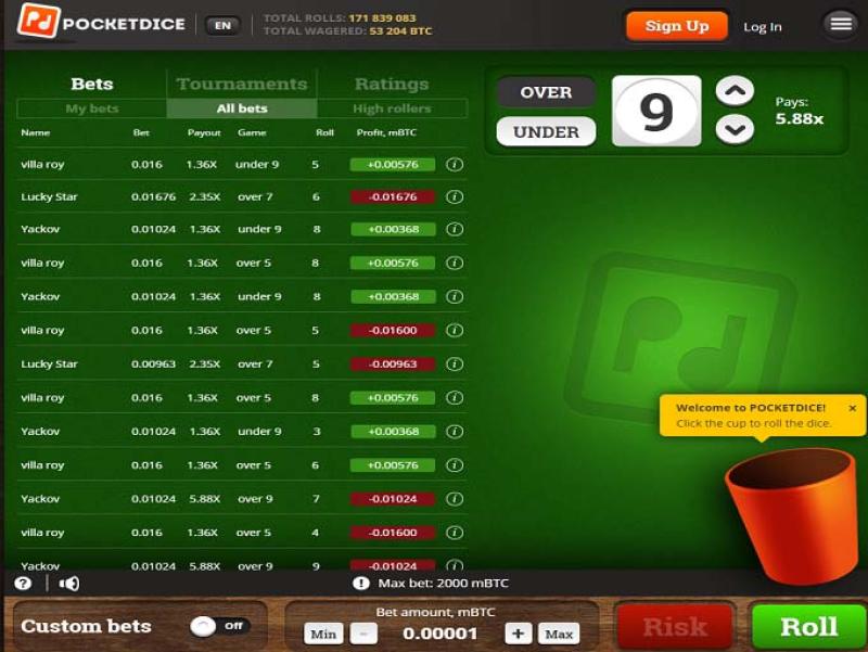 PocketDice — это онлайн-сайт для ставок, использующий биткойны и позволяющий игрокам делать ставки на «больше» или «меньше» выбранного числа, выпавшего на паре игральных костей. Сайт очень прост по своему интерфейсу и предлагает только одну игру — бросание костей, но обеспечивает мгновенные выплаты победителям. PocketDice не регулируется ни в одной юрисдикции, и игрокам следует проявлять осторожность, если они решат попробовать эту биткойн-игру.Информация о казино