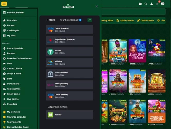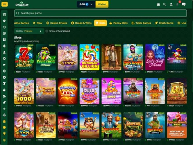 Навигация по сайту довольно проста, так как он имеет главное меню слева, которое можно развернуть для просмотра категорий. Здесь вы найдете популярные покерные игры , слоты Drops & Wins, слоты с минимальными ставками, настольные игры, игры Crash и игры в живом казино.