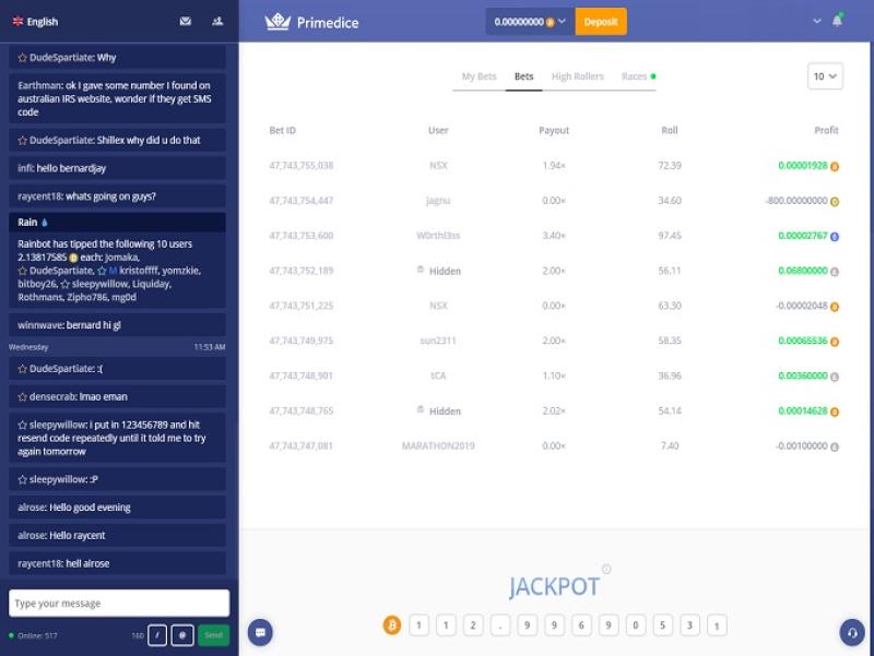 Primedice — это сайт для ставок на криптовалюту, который сильно отличается от традиционного онлайн-казино. Сайт предлагает одну игру в кости и принимает в качестве валюты только биткоины. На сайте вы делаете ставку на то, выпадет ли на кубиках число больше или меньше определенного значения, и выплата производится в зависимости от вашей догадки. Игра проста, позволяет игрокам общаться в чате во время игры, а также обеспечивает мгновенные выплаты выигрышей. Это отличает Primedice от всех других сайтов для ставок, которые я рассматривал.