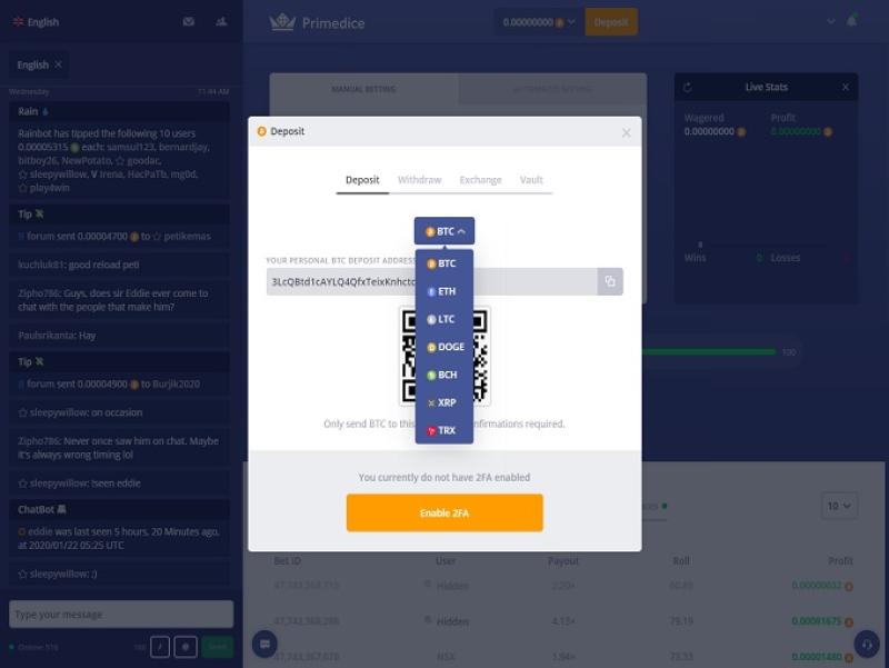Банковские операции в Primedice очень просты, поскольку казино принимает для пополнения счета и вывода средств только биткоины. Это означает, что транзакции происходят практически мгновенно, и я обнаружил, что биткоин — лучший способ быстро получить выигрыш в любом казино, которое его предлагает. На сайте не указан максимальный лимит на вывод средств, но следует отметить, что стоимость биткоина может сильно колебаться.