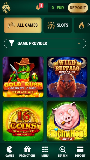В верхней части главной страницы расположен выдвижной баннер, где пользователи могут увидеть, какие бонусы и сезонные акции им доступны. Под баннером игроки могут получить доступ ко всем категориям игр, которые могут их заинтересовать.