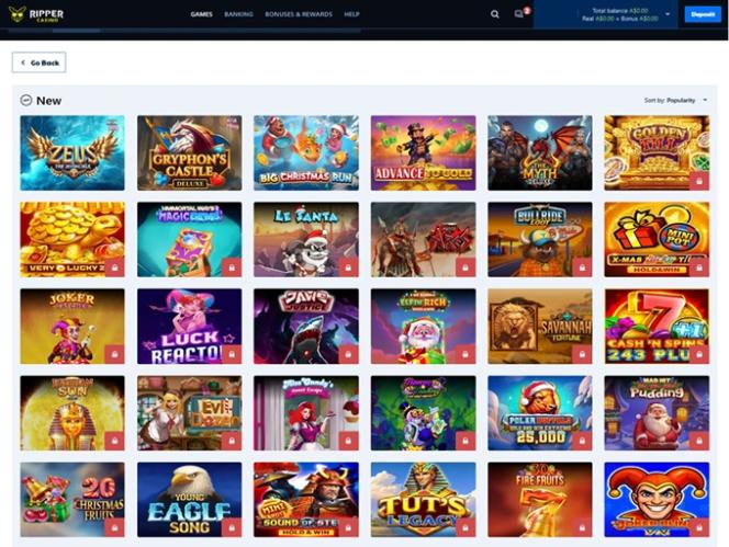 В казино Ripper представлен интересный раздел игровых автоматов с довольно большим выбором привлекательных игр: Pot of Gold, Wild Bonus Re-Spins, Red Hot Volcano, Catsino, Wizarding Wins, Surfin' Reels, Cash Pig, Golden Profits, Lava Loca, Wild Ocean, Greek Legends, Asia Wins 777, Aztec Palace, Bang Bang, Booming Seven Deluxe, Burning Classics, Wombaroo Hold and Re-Spin, Majestic Safari, Arabian Spins и многие другие.