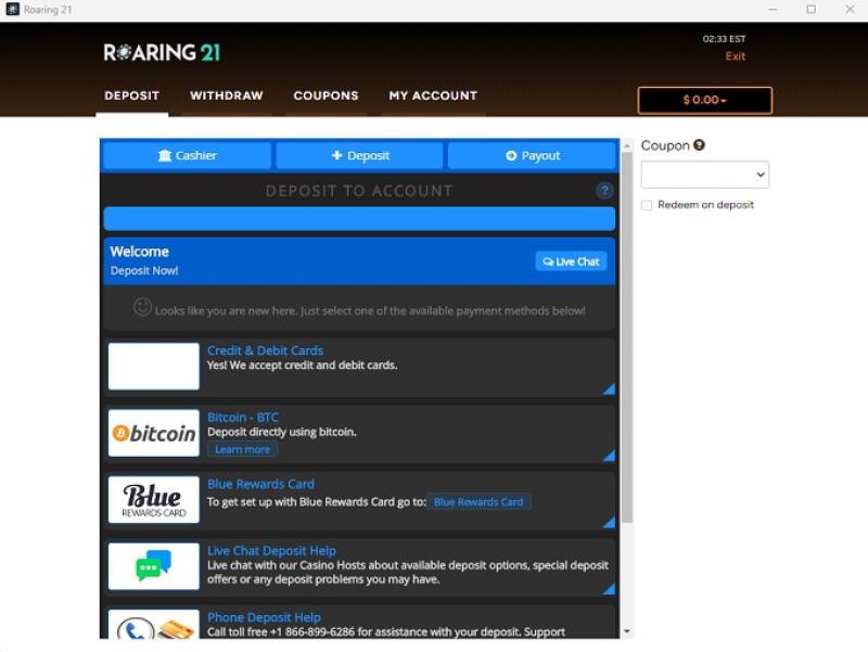 Варианты банковских операций в Roaring 21 Casino