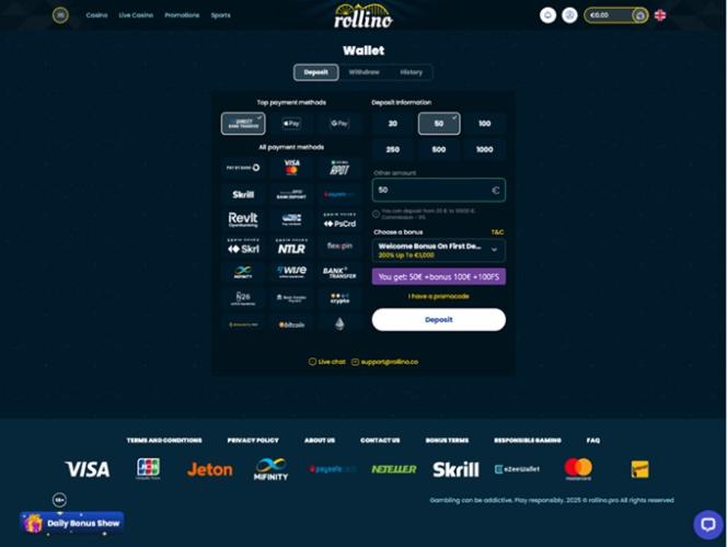 Все новые игроки смогут получить приветственный бонусный пакет, предназначенный для первых четырех депозитов в Rollino. Кроме того, щедрый приветственный бонус ждет всех хайроллеров. Обратите внимание, что этот бонус онлайн-казино действителен в течение десяти дней с момента активации.