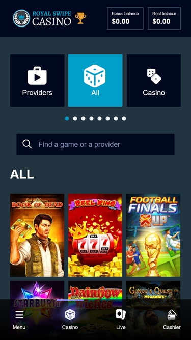 В казино Royal Swipe вы найдете в основном слоты, и сайт предлагает широкий выбор игр от таких разработчиков, как Microgaming, Thunderkick, Rabcat и других. В основном это видеослоты, но есть и несколько классических игр, которые вы можете попробовать. Если вас интересуют прогрессивные джекпоты, казино предлагает несколько призов от Microgaming, стоимость которых часто превышает миллион долларов.