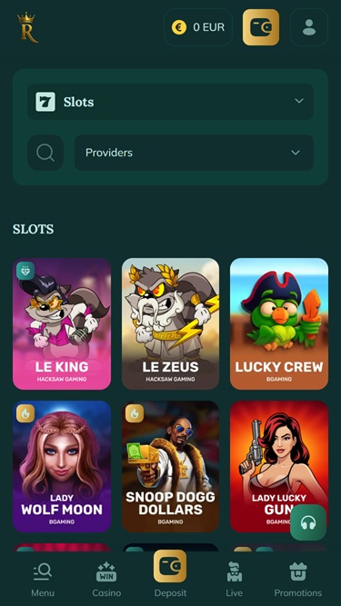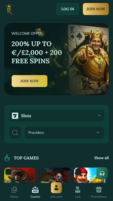 Цель казино — создать у игроков ощущение королевской роскоши, и это начинается с знакомства с сайтом, который отличается красивым оформлением, оригинальными иллюстрациями и цветовой палитрой из темно-зеленых фонов и золотых оттенков, что создает ощущение премиум-класса и эксклюзивности.