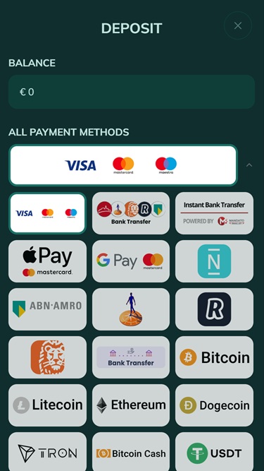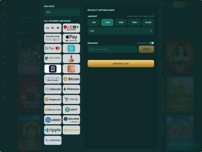 Для управления средствами Royalen позволяет пользователям использовать несколько банковских методов, включая такие популярные варианты, как Visa , Mastercard , Revolut , Maestro , Google Pay, Apple Pay , банковский перевод и Paysafecard. Кроме того, казино принимает в качестве платежных средств несколько криптовалют, включая Bitcoin , Bitcoin Cash, Cardano , Dogecoin , Ethereum, Litecoin , Solana, Tron , USD Coin и Ripple .