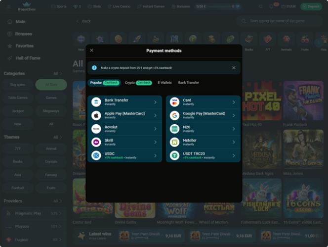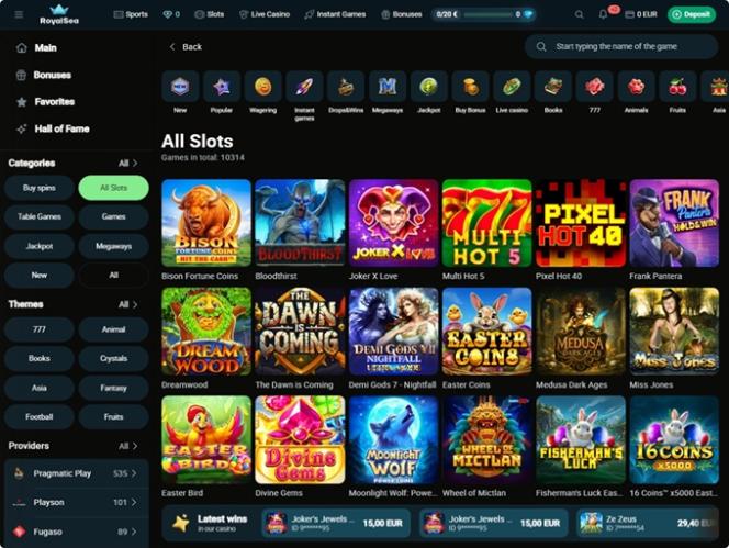 Казино RoyalSea сотрудничает с Net Entertainment, BetSoft, 1x2gaming, Big Time Gaming, ELK Studios, Evolution Gaming, Ezugi, Habanero Systems, Oryx, Play'n GO, playson, Relax Gaming, Rival, Thunderkick, WM, Yggdrasil, Endorphina, Wazdan, GameArt, Betgames, Booming Games, Stakelogic, Pragmatic Play, Nolimit City, Felt Gaming, Red Tiger Gaming, Booongo, LuckyStreak, Spinomenal, Felix Gaming, Red Rake Gaming, Inbet Games, Xprogaming, Fugaso, Belatra Games, Fantasma Games, Kalamba, Spin Games, Platipus Gaming, Skywind, Spinmatic, Spadegaming, BGAMING, Fazi, Evoplay, OneTouch, Electric Elephant Games, Pocket Games Soft, Triple PG, Bulletproof Games, Gluck Games, Mascot Gaming, Slot Factory, DLV, Spearhead Studios, Swintt, ThunderSpin, TrueLab Games, Mancala Gaming, 7Mojos, HungryBear Gaming, SmartSoft Gaming, KA Gaming, Blue Guru Games, Lady Luck Games, PureRNG, Holle Games, Caleta Gaming, mplay, Elysium Studios, Amusnet Interactive, CT Interactive, EveryMatrix, Merkur Gaming, Tom Horn Gaming, Konami, Gamomat, Mr Slotty, Reel Time Gaming, BF Games, Bally Wulff, Reflex Gaming, Wild Streak Gaming, Golden Hero, RubyPlay, 4ThePlayer, AvatarUX, Gamevy, Groove Gaming, ReelPlay, SlotVision, Indi Slots, Boomerang Studios, Hacksaw Gaming, Max Win Gaming, Bang Bang Games, Gamzix, Slotmill, Triple Cherry, SilverBack Gaming, Peter And Sons, Absolute Live Gaming, Onlyplay, FastSpin, Armadillo Studios, Gamebeat, FlipLuck, PoggiPlay, GoldenRace, Aviatrix, TaDa Gaming, 3 Oaks Gaming, Amigo Gaming, Spribe, Print Studios, 1spin4win, 5Men Gaming, Gaming Corps, Elbet, Four Leaf Gaming, Atomic Slot Lab, Reel Kingdom, Givme Games, JVL, Indigo Magic, Zillion Games, ICONIC21, Galaxsys, VoltEnt, Kitsune Studios, InOut Games, PlayAce and Turbo Games .