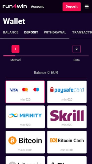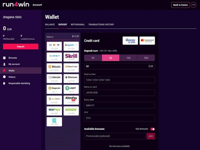 В казино Run4Win представлен широкий выбор способов оплаты, включая криптовалюты, а также другие популярные платежные системы, такие как Visa, Mastercard, Neteller, Skrill, банковский перевод , Astropay и другие.