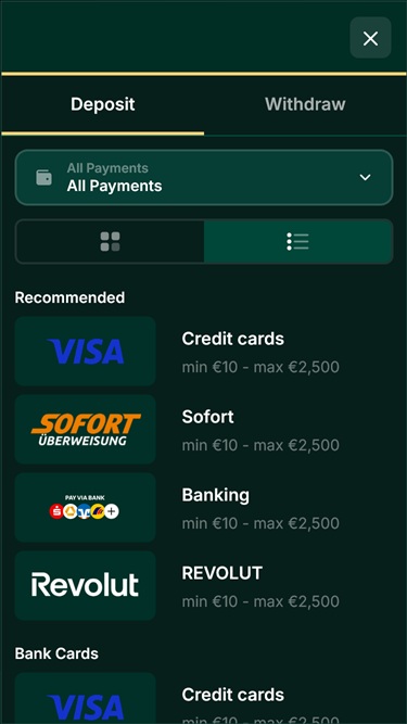Хотя казино поддерживает банковские переводы, популярные криптовалюты, платежные карты и широко используемые электронные кошельки, некоторые из этих вариантов могут быть недоступны игрокам в зависимости от страны их проживания, поскольку определенные способы оплаты не во всех юрисдикциях доступны для онлайн-гемблинга. Обязательно уточните заранее, доступен ли вам предпочитаемый вами способ оплаты.