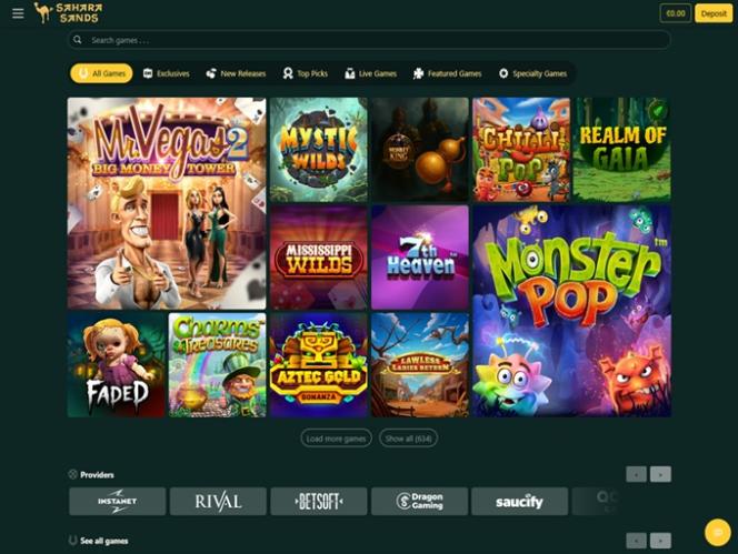 Казино Sahara Sands работает на программном обеспечении BetSoft, Genesis Gaming, Rival, Saucify, Vivo Gaming, Spinomenal, Felix Gaming, Fugaso, Radi8 Games, Fresh Deck Studios, Woohoo Games, Qora Games, SmartSoft Gaming, Tom Horn Gaming, Genii, Wager Gaming, Dragon Gaming and Dragoon Soft , что обеспечивает ему обширную библиотеку слотов, настольных игр, видеопокера и настольных игр. Доступ к казино возможен как через загружаемое программное обеспечение, так и через веб-браузер в режиме мгновенной игры.Другие игры