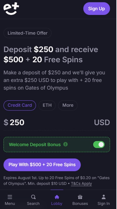 Что касается способов пополнения счета, вы можете выбрать стандартные варианты, такие как MasterCard или Visa . Вы также можете выбрать пополнение счета криптовалютой, поскольку это стало очень популярным вариантом в последние пару лет, и нам бы хотелось, чтобы операторы включали эти способы.