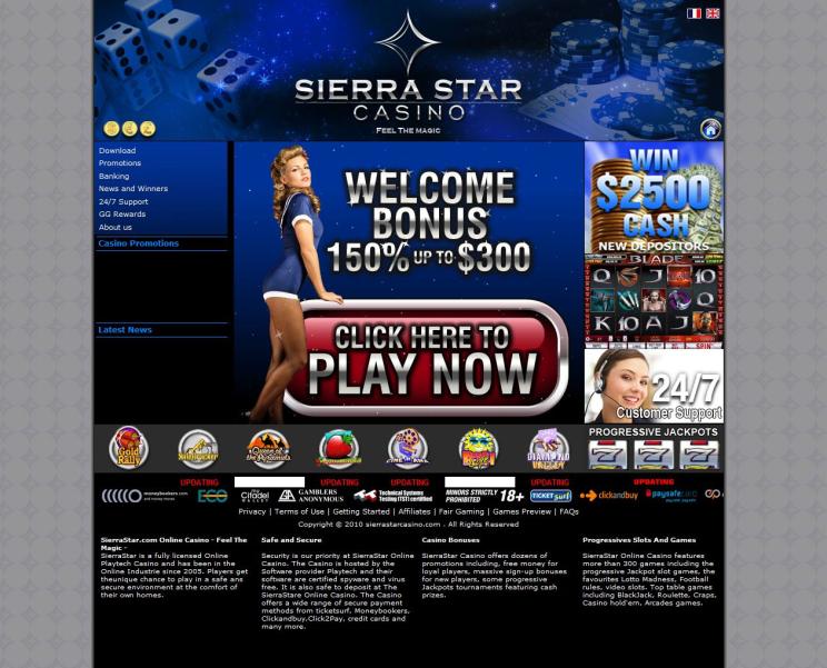 Казино Sierra Star работает на программном обеспечении Playtech , что обеспечивает библиотеку игр, доступных как через загружаемое программное обеспечение, так и в режиме мгновенной игры, позволяющем играть непосредственно в веб-браузере.Blackjack