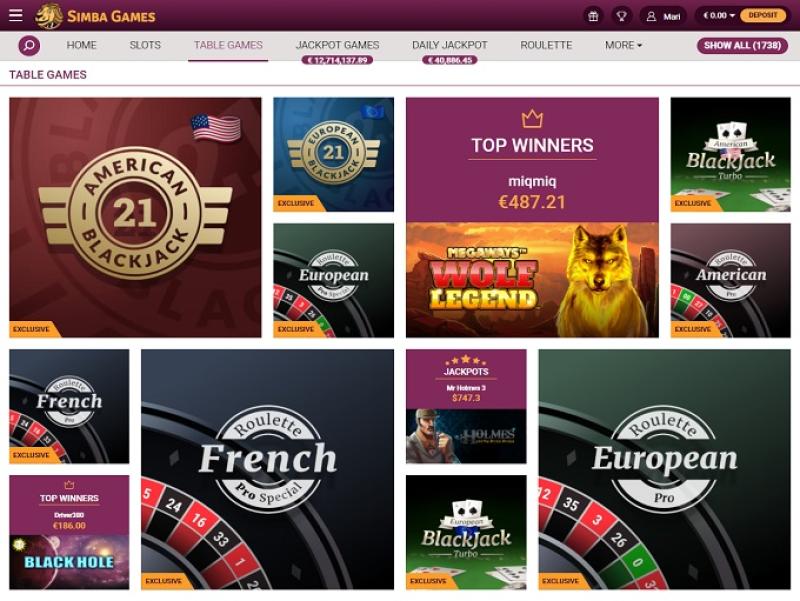 В каталоге Simba Games представлено огромное количество видеослотов от Bally, Net Ent, WMS и NextGen, включая игры, разработанные как для наземных казино, так и для онлайн-игр. Также доступны классические слоты, хотя их гораздо меньше, чем современных 5-барабанных игр. В Simba Games также предлагаются прогрессивные джекпоты от Net Ent, достигающие миллионов долларов, среди которых Mega Fortune, Cosmic Fortune, Hall of Gods и Arabian Nights.