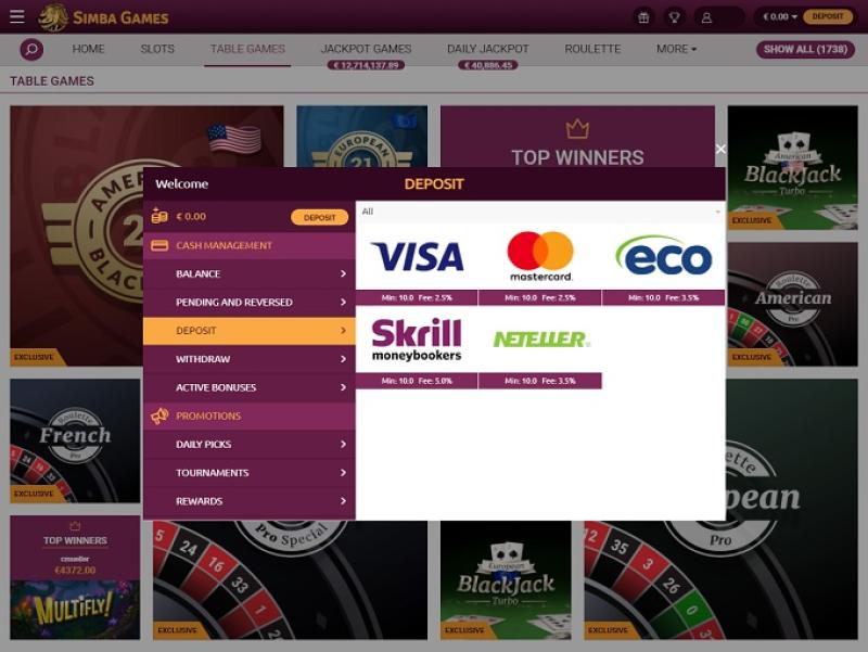 Прочитав условия и положения казино Simba Games, я не нашел ничего, что бы указывало на несправедливость или хищническое отношение к игрокам. Для пополнения и вывода средств принимаются Visa, MasterCard, Neteller, Skrill, EntroPay, PayPal, банковские переводы, Poli и другие. Время обработки платежей отличное: электронные кошельки обрабатываются в тот же день, а кредитные карты и банковские переводы — в течение 2-7 рабочих дней. Следует отметить, что существует лимит на вывод средств в размере 10 000 долларов США в месяц.