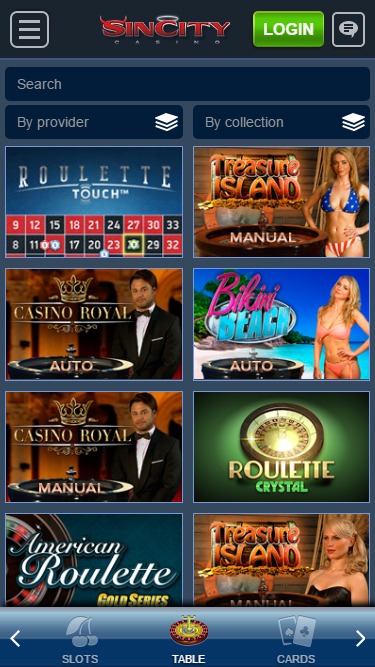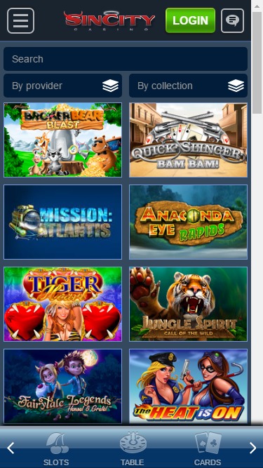 Казино Sin City работает на программном обеспечении Microgaming, Net Entertainment, 1x2gaming, Big Time Gaming, Genesis Gaming, iSoftBet, Oryx, Quickspin, Rabcat, GameArt, Games Global, 2by2 Gaming, bluberi, Games Warehouse, NextGen, RCT Gaming and HollywoodTV , а игры предоставляются через веб-платформу с мгновенной игрой, позволяющую играть прямо в браузере. Также предусмотрена поддержка мобильных устройств, позволяющая играть в слоты и настольные игры прямо на смартфоне или планшете.