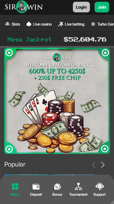 Помимо целевой аудитории бренда, мы рады приветствовать и других международных игроков, поэтому, даже если вы из другой юрисдикции, оставайтесь с нами! SirWin предлагает отличные спортивные события и первоклассные игры казино, и на первый взгляд выглядит привлекательно и заманчиво.