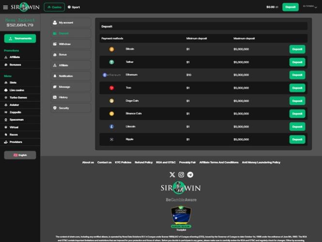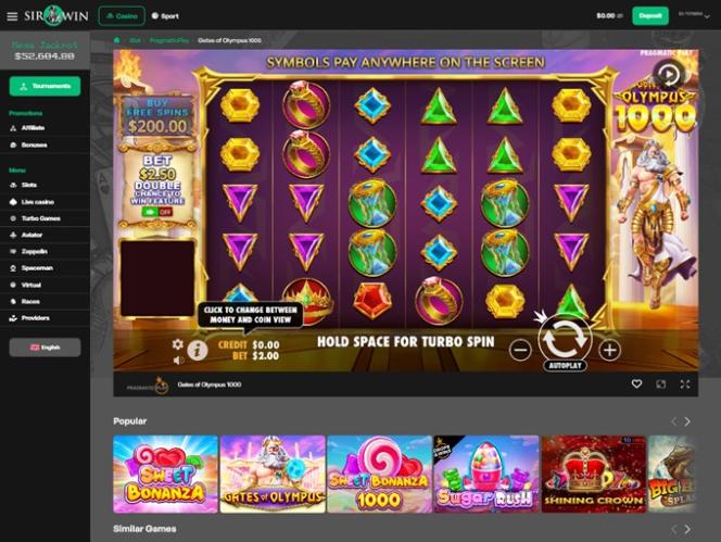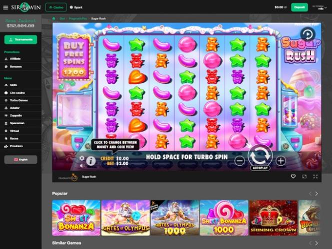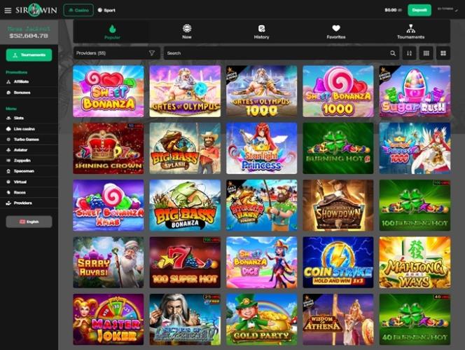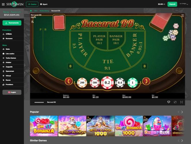 Креативное графическое решение казино и цветовая гамма, вдохновленная деньгами, создают приятную атмосферу азартной игры. Все детали выглядят четко и аккуратно, и общее впечатление таково, что здесь все хорошо организовано. Регистрация проста, и игрокам не потребуется много времени, чтобы найти свой любимый игровой контент в SirWin Casino, особенно если их интересуют такие игры, как Aviator, Spaceman, Zeppelin, Pilot, Goal, Plinko, Hilo, Sultan's Gift, Drunk Santa, The Mystery Of Faberge, Cash Galaxy, Dice, High Low, Vortex, Ball & Ball, Lucky Numbers X20, Mini Roulette, Lucky Numbers X12 и другие популярные игры.