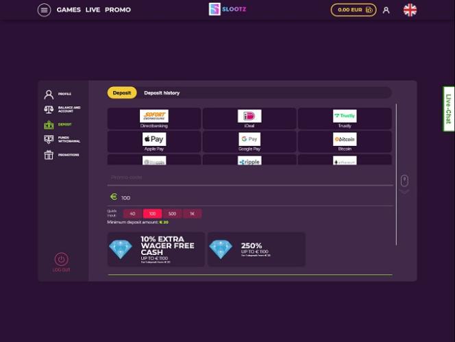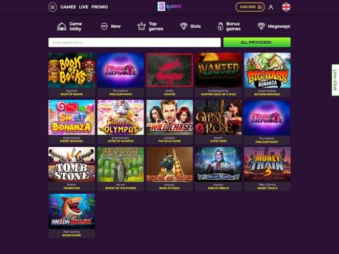 Slootz — это бренд, ориентированный на игроков с живыми дилерами , и он предлагает привлекательные игры, такие как: Video Blackjack, Imperial Quest, Roleta Da Sorte, Blackjack Da Sorte, Dragon Tiger Da Sorte, Three Card Poker, Instant Lucky 7, Extra Chili Epic Spins, Grand Korean Blackjack, Bonsai Baccarat A, Bonsai Baccarat B, Bonsai Baccarat C, Korean Speed Baccarat F, Speed Baccarat in Spanish, Football Studio in Spanish, Funky TimeMega Ball in Spanish 100x, Spanish Lightning Roulette, Spanish Speed Roulette, Prive Lounge Blackjack 1, Spanish Roulette Live, Prive Lounge Blackjack 2, Prive Lounge Blackjack 3, Roulette Galaxy 1, Prive Lounge Blackjack 4, French Roulette, Las Vegas Blackjack, Brazilian Roulette Live, English Casino Hold'em, Teen Patti и многие другие.