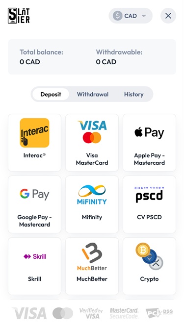 Slotier предлагает превосходный набор способов оплаты , валют и криптовалют, включая Bitcoin, канадский доллар , Dogecoin, Ethereum, евро, Litecoin, Solana, Toncoin, TRON, USD Coin, Tether и Ripple.