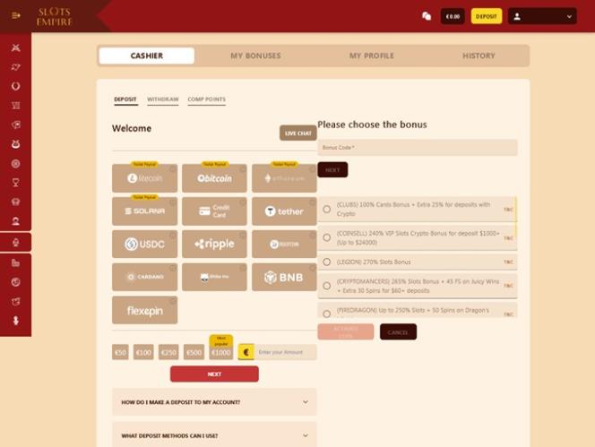 Интерфейс немного неуклюжий. Функциональность всегда должна быть выше эстетики. После того, как мне пришлось дважды предоставить информацию для бонуса, мне дали только 30 долларов из 40. Я поискал, и у них нет бонуса в 30 долларов, который я мог бы найти. Попробовал несколько игр, но слоты тесные. Я бы не рекомендовал Slots Empire
