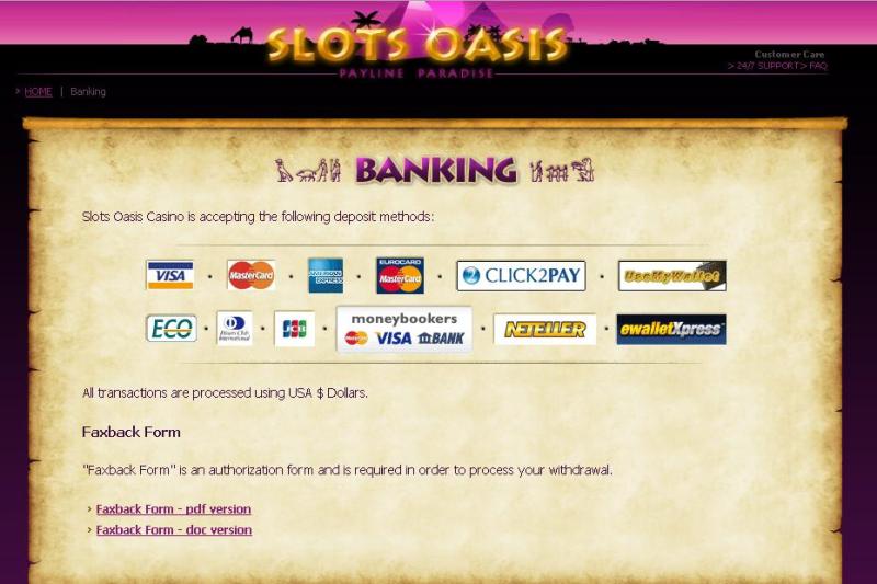Казино Slots Oasis — это онлайн-букмекерская контора, принадлежащая и управляемая компанией Rushpod Investments NV. Открытое в 2008 году, казино Slots Oasis имеет ужасную репутацию среди игроков и партнерских сайтов из-за очень медленной обработки выплат и неустранения проблем, возникающих в системе обработки платежей. Из-за этого Slots Oasis внесено в черный список этого сайта.Информация о казино