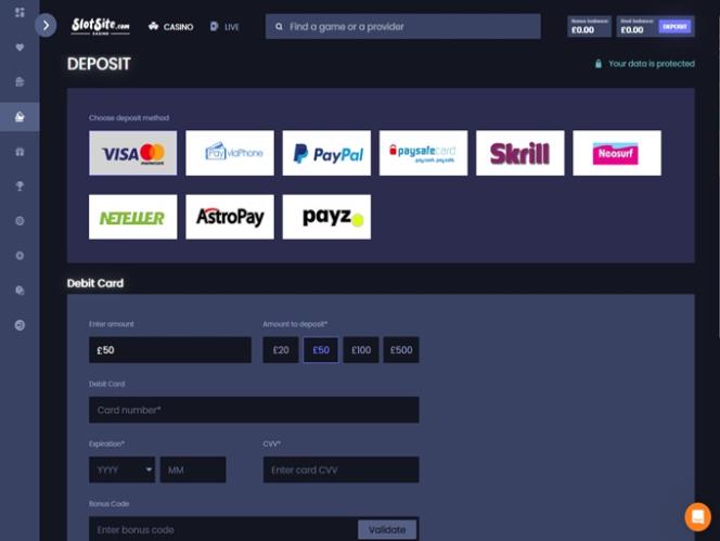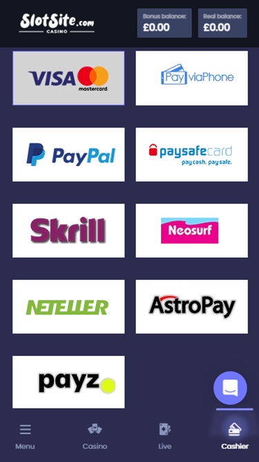 Что касается способов оплаты , доступных игрокам, оператор гарантирует широкий выбор банковских методов. В казино Slotsite игроки могут использовать популярные дебетовые и кредитные карты, совершать транзакции посредством прямых банковских переводов, а также широко распространенные электронные кошельки, такие как Skrill, PayPal, Neteller и другие онлайн-платежные системы.