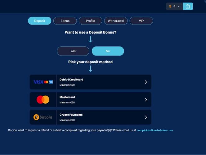 Slotwhales предлагает своим игрокам выбор между современными и традиционными способами оплаты. Пользователи криптовалют будут рады узнать, что в качестве способов оплаты они могут использовать Bitcoin , Ethereum , Litecoin и Tether .