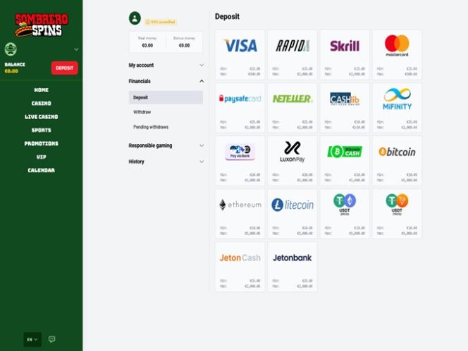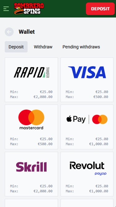 Что касается программы лояльности, к сожалению, в Sombrero Spins нет стандартной системы, в которой автоматически участвует каждый игрок. Вместо этого игроки получают приглашение в VIP-клуб, куда можно попасть только по приглашению, и где им предоставляются различные преимущества, такие как более быстрый вывод средств, эксклюзивные предложения и персональные VIP-менеджеры. Подтверждая свою активность и постоянно играя в игры казино, вы увеличиваете свои шансы на приглашение в VIP-клуб.