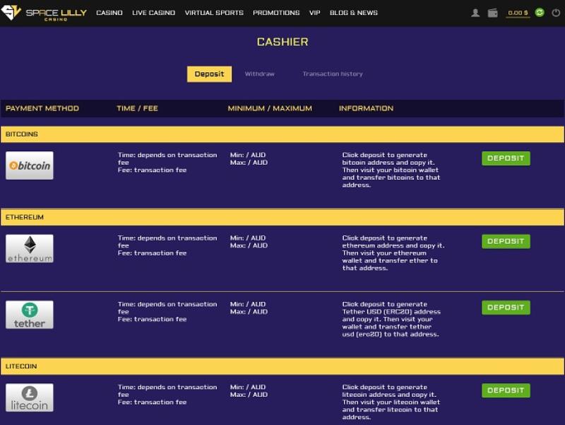 Банковская система в Space Lilly неплохая, хотя и несколько примечательная. Казино принимает депозиты и снятие средств через банковский перевод, MasterCard, Skrill, Neteller, Paysafecard, Visa, ecoPayz и iDebit. Время обработки запросов на вывод средств составляет 48 часов, выплаты через электронные кошельки осуществляются в течение 24 часов, а другими способами — примерно через 2-4 рабочих дня.