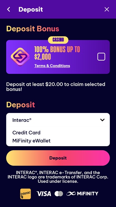 Визуально сайт отличается легким пользовательским интерфейсом и минималистичным дизайном, что обеспечивает невероятно быструю загрузку и удобную навигацию. В то же время цветовая палитра с темными фонами и фиолетовыми тонами придает казино особый шарм и индивидуальность. Любителям минималистичного дизайна понравится проводить здесь время, поскольку пространство не перегружено лишними элементами.