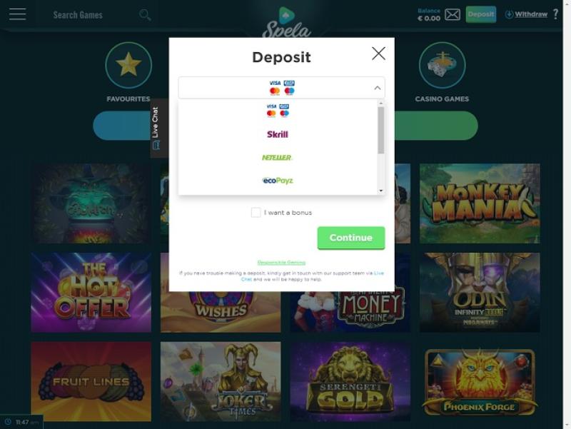 Казино Spela работает на программном обеспечении Microgaming, Net Entertainment, Big Time Gaming, ELK Studios, Evolution Gaming, Ezugi, Genesis Gaming, Oryx, Play'n GO, Rabcat, Relax Gaming, Thunderkick, Yggdrasil, Wazdan, Red Tiger Gaming, Fantasma Games, Kalamba, Skywind, Switch Studios, TrueLab Games, Games Global, 2by2 Gaming, bluberi, Games Warehouse, NextGen, Push Gaming, Geco Gaming, Gamomat, Old Skool Studios, ReelPlay, Half Pixel Studios, SilverBack Gaming, Eurostar Studios and Aurum Signature Studios , а игры предоставляются через веб-платформу мгновенной игры, которая загружается непосредственно в вашем любимом интернет-браузере. Это избавляет от необходимости загрузки дополнительного программного обеспечения, и сайт работает безупречно. Также предусмотрена возможность игры на мобильных устройствах, и сайт отлично выглядит на небольших экранах.