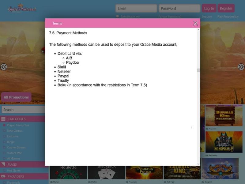 Spin Princess не принимает игроков из следующих стран: Афганистан, Алабама, Аландские острова, Аляска, Албания, Альберта, Олдерни, Алжир, Американское Самоа, Андорра, Ангола, Ангилья, Антарктида, Антигуа и Барбуда, Аргентина, Аризона, Арканзас, Армения, Аруба, Австралия, Австрия, Азербайджан, Багамы, Бахрейн, Бангладеш, Барбадос, Беларусь, Бельгия, Белиз, Бенин, Бермудские острова, Бутан, Боливия, Босния и Герцеговина, Ботсвана, Остров Буве, Бразилия, Британская Колумбия, Британская территория в Индийском океане, Бруней, Болгария, Буркина-Фасо, Бурунди, Калифорния, Камбоджа, Камерун, Канада, Кабо-Верде, Каймановы острова, Центральноафриканская Республика, Чад, Чили, Китай, Остров Рождества, Кокосовые (Килингтонские) острова, Колумбия, Колорадо, Коморские острова, Конго, Демократическая Республика Конго, Коннектикут, Острова Кука, Коста-Рика, Берег Слоновой Кости, Хорватия, Куба, Кюрасао, Кипр, Чешская Республика, округ Колумбия, Делавэр, Дания, Джибути, Доминика, Доминиканская Республика, Эквадор, Египет, Сальвадор, Экваториальная Гвинея, Эритрея, Эстония, Эфиопия, Фолклендские острова (Мальвинские острова), Фарерские острова, Фиджи, Финляндия, Флорида, Франция, Французская Гвиана, Французская Полинезия, Французские Южные Территории, Габон, Гамбия, Джорджия, Джорджия, Германия, Гана, Гибралтар, Греция, Гренландия, Гренада, Гваделупа, Гуам, Гватемала, Гвинея, Гвинея-Бисау, Гайана, Гаити, Гавайи, Острова Херд и Макдональд, Гондурас, Гонконг, Венгрия, Исландия, Айдахо, Иллинойс, Индия, Индиана, Индонезия, Айова, Иран, Ирак, Ирландия, Остров Мэн, Израиль, Италия, Ямайка, Япония, Джерси, Иордания, Канзас, Казахстан, Кентукки, Кения, Кирибати, Корейская Народная Демократическая Республика, Республика Корея, Кувейт, Кыргызстан, Лаос, Латвия, Ливан, Лесото, Либерия, Ливия, Лихтенштейн, Литва, Луизиана, Люксембург, Макао, Мадагаскар, Мэн, Малави, Малайзия, Мальдивы, Мали, Мальта, Манитоба, Маршалловы острова, Мартиника, Мэриленд, Массачусетс, Мавритания, Маврикий, Майотта, Мексика, Мичиган, Микронезия, Федеративные Штаты, Миннесота, Миссисипи, Миссури, Молдавия, Монако, Монголия, Монтана, Черногория, Монтсеррат, Марокко, Мозамбик, Мьянма, Намибия, Науру, Небраска, Непал, Нидерланды, Нидерландские Антильские острова, Невада, Нью-Брансуик, Новая Каледония, Нью-Гэмпшир, Нью-Джерси, Нью-Мексико, Нью-Йорк, Новая Зеландия, Ньюфаундленд и Лабрадор, Никарагуа, Нигер, Нигерия, Ниуэ, Остров Норфолк, Северная Каролина, Северная Дакота, Северная Македония, Северные Марианские острова, Северо-Западные территории, Норвегия, Новая Шотландия, Нунавут, Огайо, Оклахома, Оман, Онтарио, Орегон, Пакистан, Дворец, Палестина, Панама, Папуа-Новая Гвинея, Парагвай, Пенсильвания, Перу, Филиппины, Питкэрн, Польша, Португалия, Остров Принца Эдуарда, Пуэрто-Рико, Катар, Квебек, Воссоединение, Род-Айленд, Румыния, Россия, Руанда, Святая Елена, Сент-Китс и Невис, Сент-Люсия, Святой Мартин, Сен-Пьер и Микелон, Сент-Винсент и Гренадины, Самоа, Сан-Марино, Сан-Томе и Принсипи, Саскачеван, Саудовская Аравия, Сенегал, Сербия, Сейшельские острова, Сьерра-Леоне, Сингапур, Словакия, Словения, Соломоновы острова, Сомали, ЮАР, Южная Каролина, Южная Дакота, Южная Георгия и Южные Сандвичевы острова, Южный Судан, Испания, Шри-Ланка, Судан, Суринам, Шпицберген и Ян-Майен, Свазиленд, Швеция, Швейцария, Сирия, Тайвань, Таджикистан,