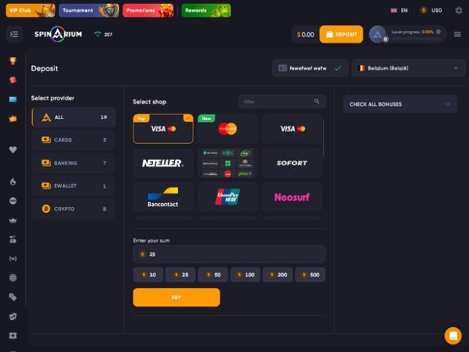 Пополнение счета, внесение депозитов и вывод средств в казино Spinarium просты и удобны. Казино предоставляет безопасные платежи через различные банковские системы , включая популярные криптовалюты и криптовалютные платежные системы, дебетовые и кредитные карты, электронные кошельки и другие онлайн-платежные сервисы.