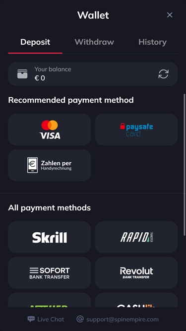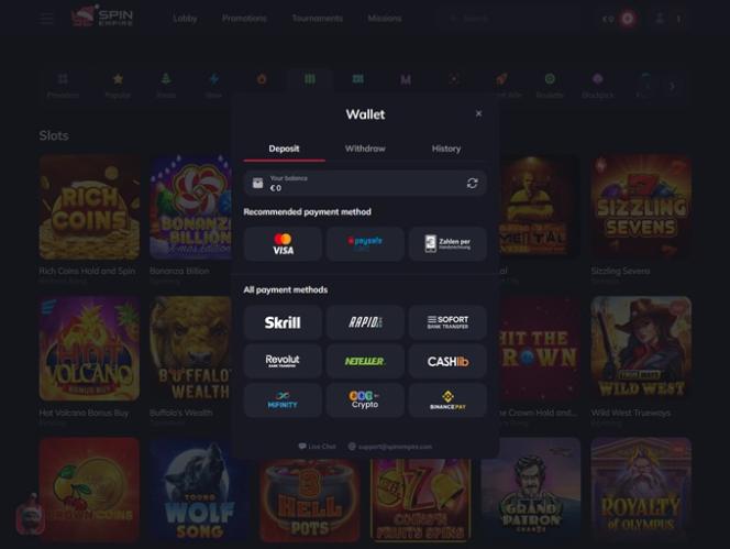 Все запросы на вывод средств обрабатываются очень быстро: время ожидания составляет около тридцати минут, а среднее время обработки после одобрения вывода — всего пять минут, что делает SpinEmpire отличным выбором для игроков казино, которые хотят быстрых выплат и гибких способов оплаты.